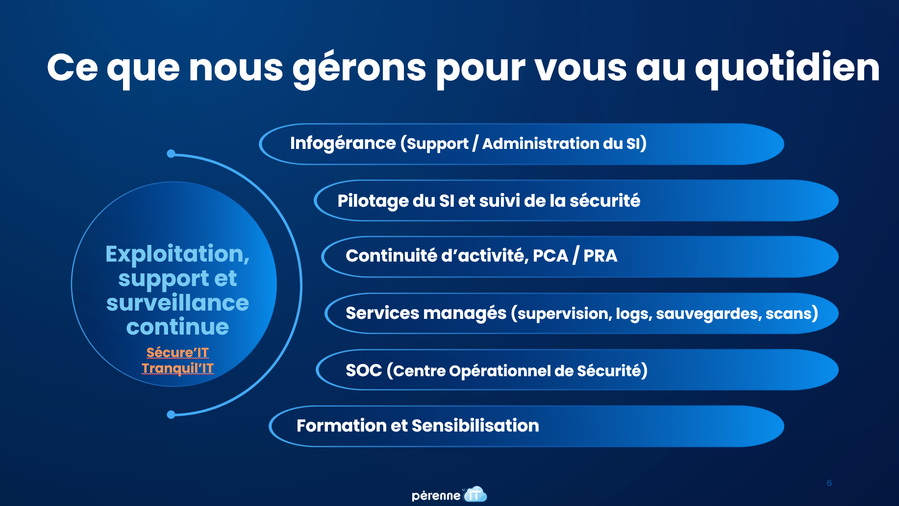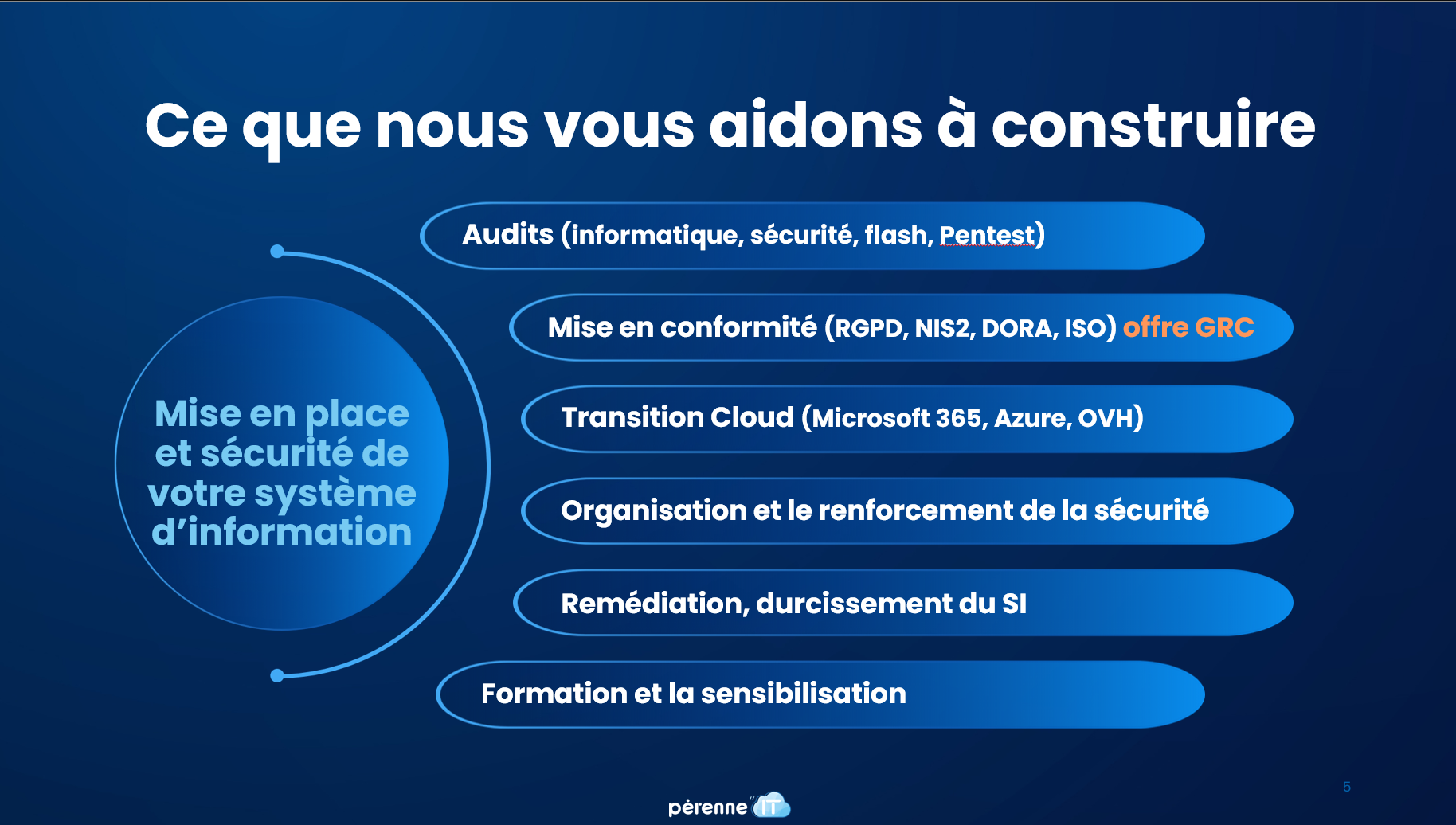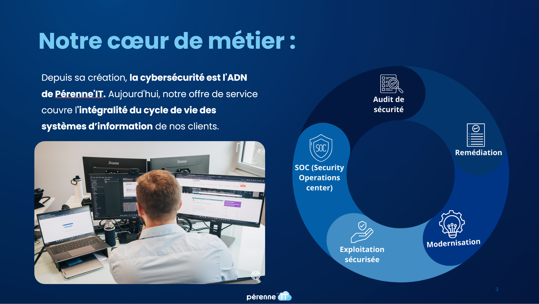 Depuis sa création, la cybersécurité est l'ADN de Pérenne'IT. Aujourd'hui, notre offre de service couvre l'intégralité du cycle de vie des systèmes d’information de nos clients.